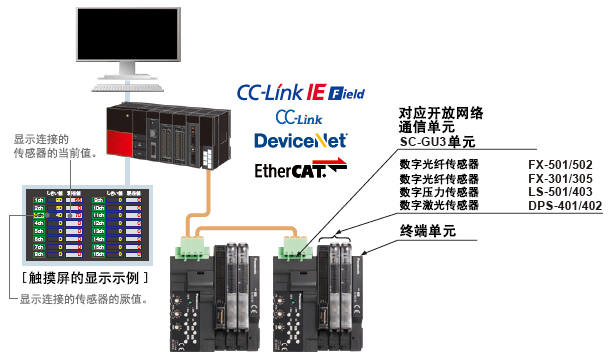 通过对应开放网络的通信单元SC-GU3系列可以连接至开放网络CC-Link IE Field/CC-Link/DeviceNet/EtherCAT。PLC、电脑等监控仪器都可以进行连接设置。