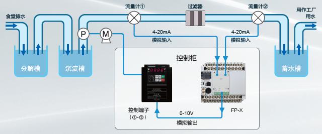 ■从FP-X输出的速度指令(0-10V模拟输出)依据流量计②的值。流量计的值变小后,为提高泵压,增加模拟输出值。