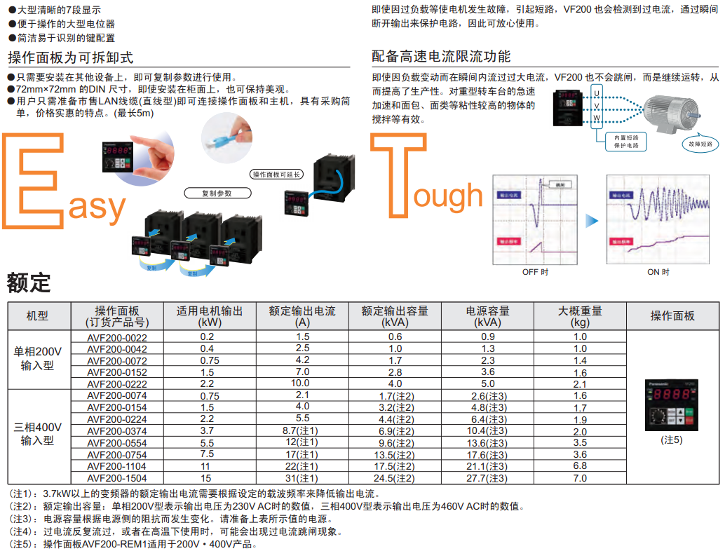 即使因过负载等使电机发生故障,引起短路,VF200 也 会检测到过电流,通过瞬间断开输出来保护电路,因此可 放心使用。