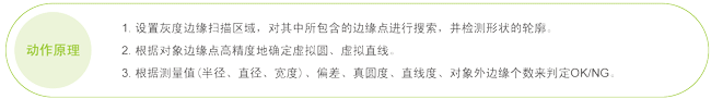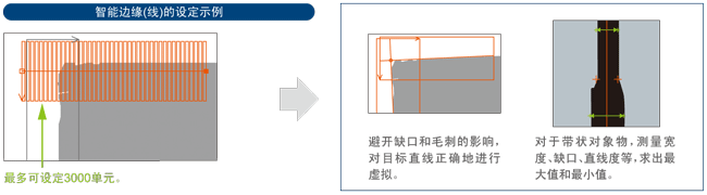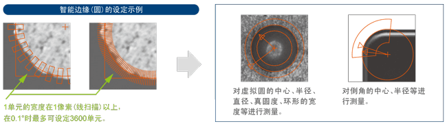 正確地虛擬于圓、線。在1個區域內,圓的邊緣點多可檢測到3600點,而線的邊緣點多可檢測到3000點,從而飛躍性地提高了精度,可進行尺寸、位置測量。同時,大幅度地削減了設定工時。