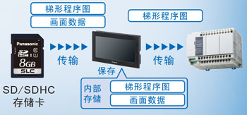 无需使用计算机,即可利用SD存储卡传输PLC程序和可编程智能操作面板的画面。另外,在可编程智能操作面板内部对PLC程序和GT画面进行备份,随时可恢复如初。