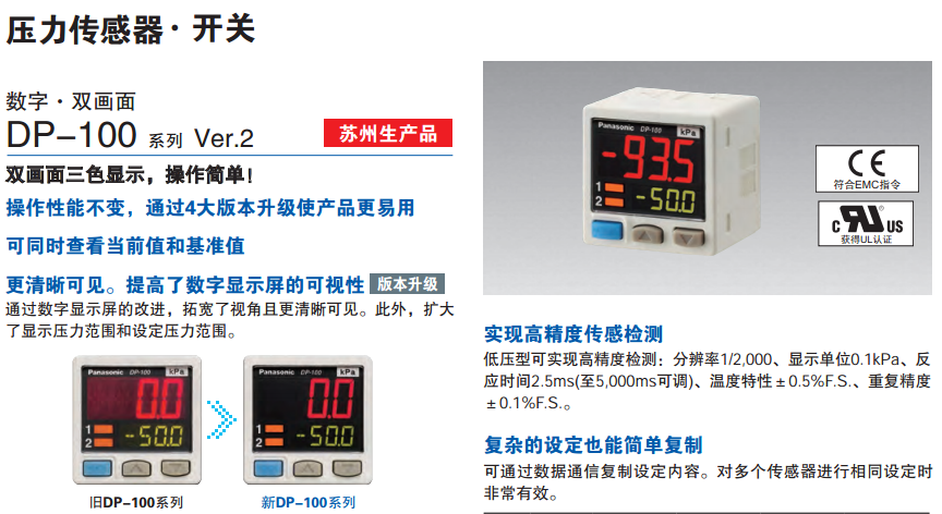 低压型实现了分辨率 1/2,000的0.1kPa单位显示、反应时间2.5ms(多5,000ms可变)、温度特性±0.5%F.S.、重复精度±0.1%F.S.和高精度检测。